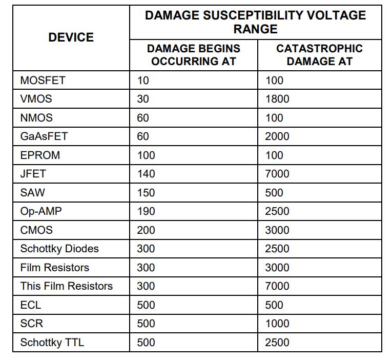 将表中的值進行快速比較,列出瞭(le)檢測(cè)儀器件的敏感性水平,這說明瞭(le)爲什麽《半導體可靠性新聞》估計大約 60% 的器件故障是由靜電損壞造成的釋放。