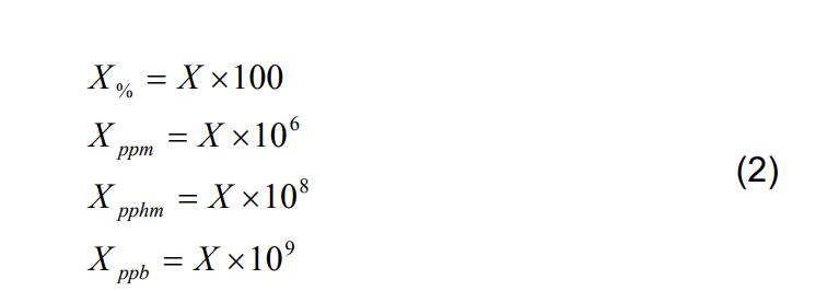 這通常是一個(gè)非常小的數字,因此混合比通常以百分比、百萬分之幾、億分之幾或十億分之幾(全部按體積(jī),而不是質量)表示,如下所示: