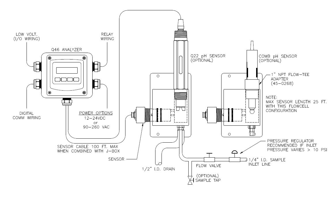标準型号 Q46H/64 系統包括三個主要組件:Q46H 分析儀、恒壓頭流通池和臭氧傳感器。密封流通池也可用於(yú)可以仔細控制樣品流速和壓力的應用。圖 1 顯示瞭(le)一個典型的安裝。