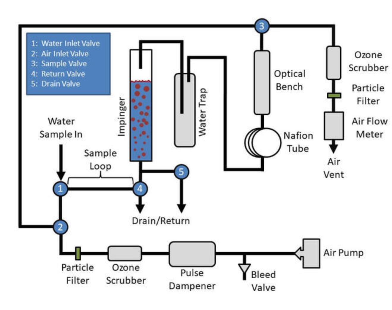 下面的示意圖顯示瞭(le)儀器操作所需的附加組件。其中包括用於調節空氣流速的放氣閥、用於減少氣流波動的脈沖阻尼器、用於從環境空氣中去除臭氧的臭氧洗滌器用於噴射樣品並(bìng)從排出的空氣中洗滌臭氧、空氣顆粒過濾器、用於保護空氣的集水器光學平台暴露於液态水,Nafion 管平衡環境空氣的濕度,以及空氣流量計。